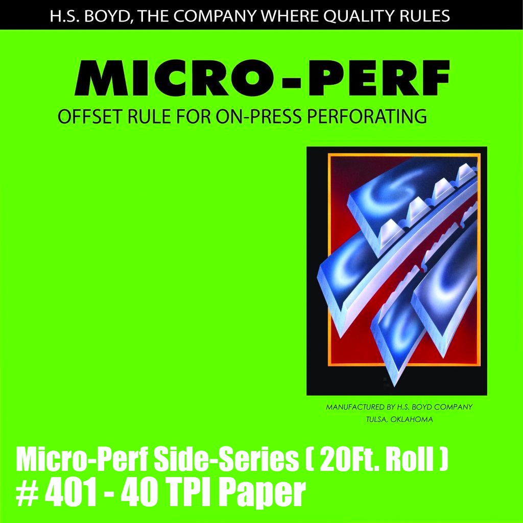 Micro-Perf is ideal for perforating continuous-feed forms, creating a perforation line that remains clean with no stray fibers or rough edges. The rules are available in a rule height of .022 up to .029 inch, designed for use on paper or card stocks. Micro-Perf is also ideal for jobs that will be passed through a laser printer after being perforated.